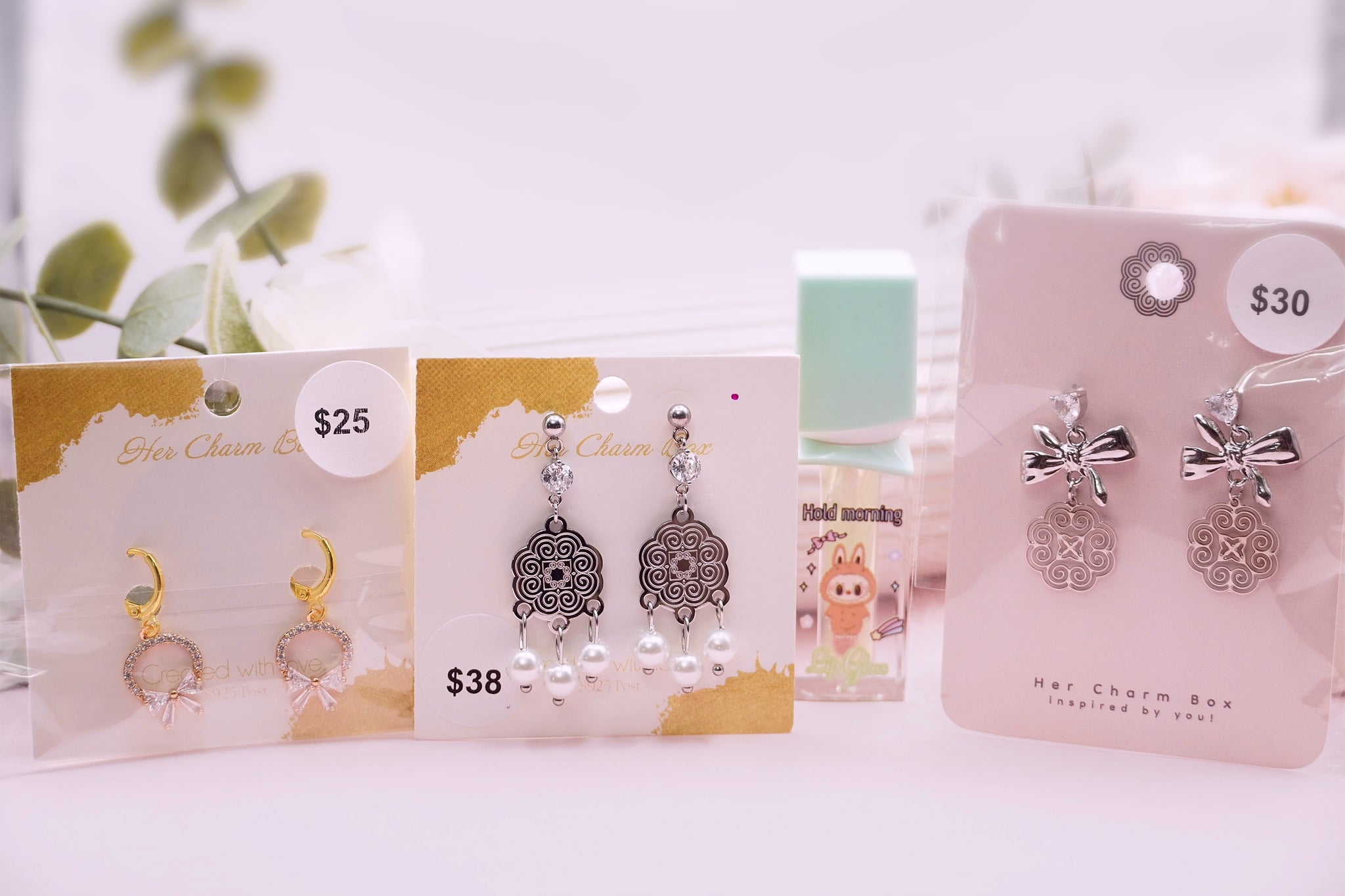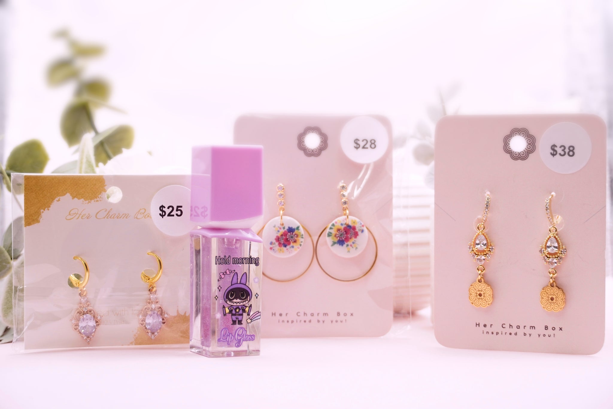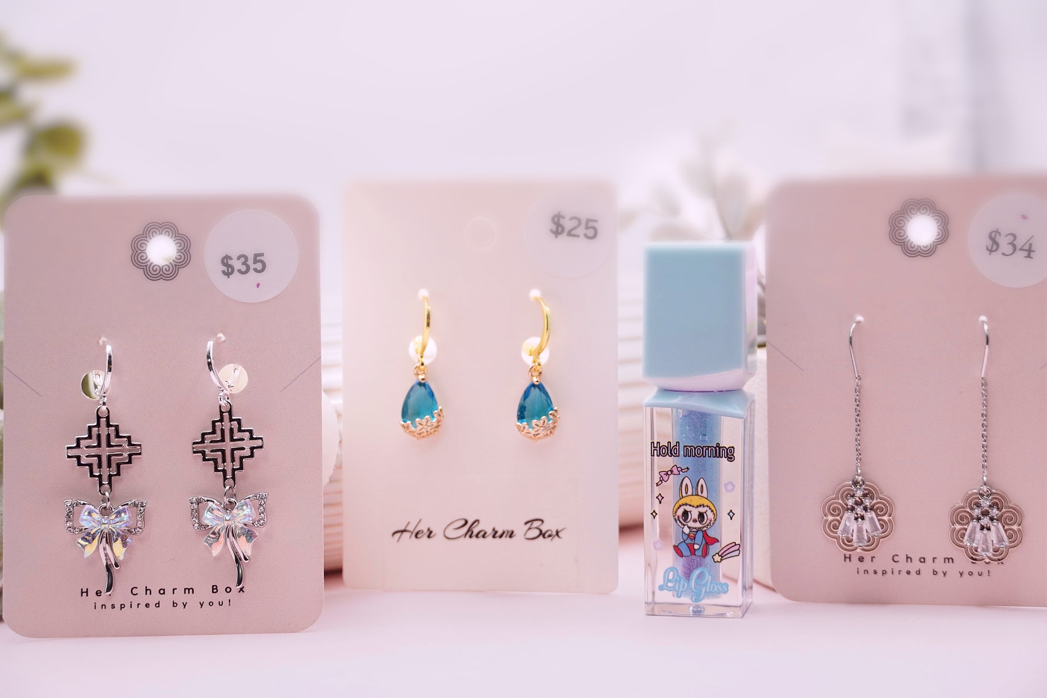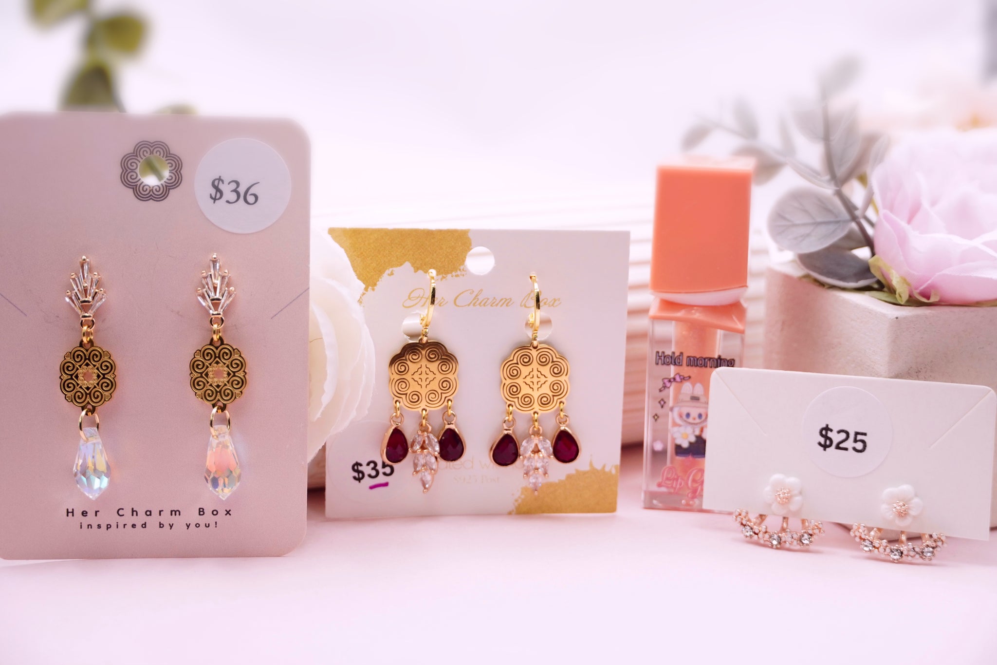 5 Colors available. Includes 3 pairs of earrings and a lip gloss tint. Tint is a sheer pink and long lasting.